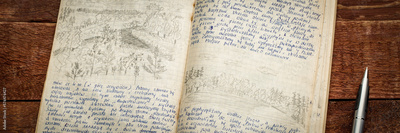 Kayak expedition journal - handwriting in Polish and drawing in pencil against rustic weathered wood.