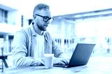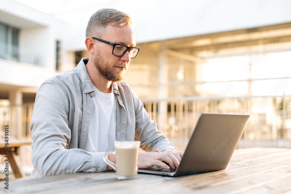 Focused smart caucasian man with a glasses and in a casual stylish clothes, IT specialist, developer, programmer, working in a laptop outdoors, developing a new program, writing code