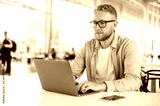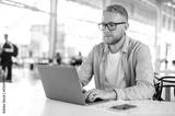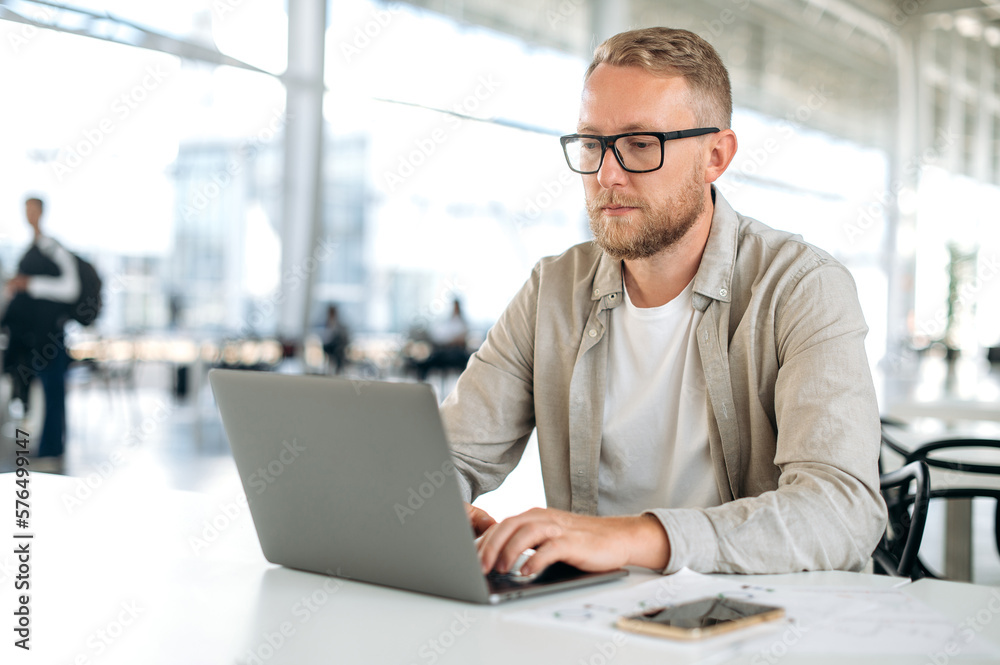 Concentrated busy caucasian man with glasses, in stylish casual wear, IT specialist, software tester, programmer, digital developer, works in a laptop in modern office, testing a new program