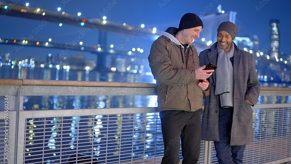 Friends relaxing at Brooklyn Bridge by night - travel photography