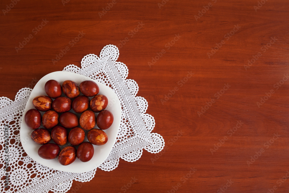 Easter time. Traditional Easter eggs on table. Copy space