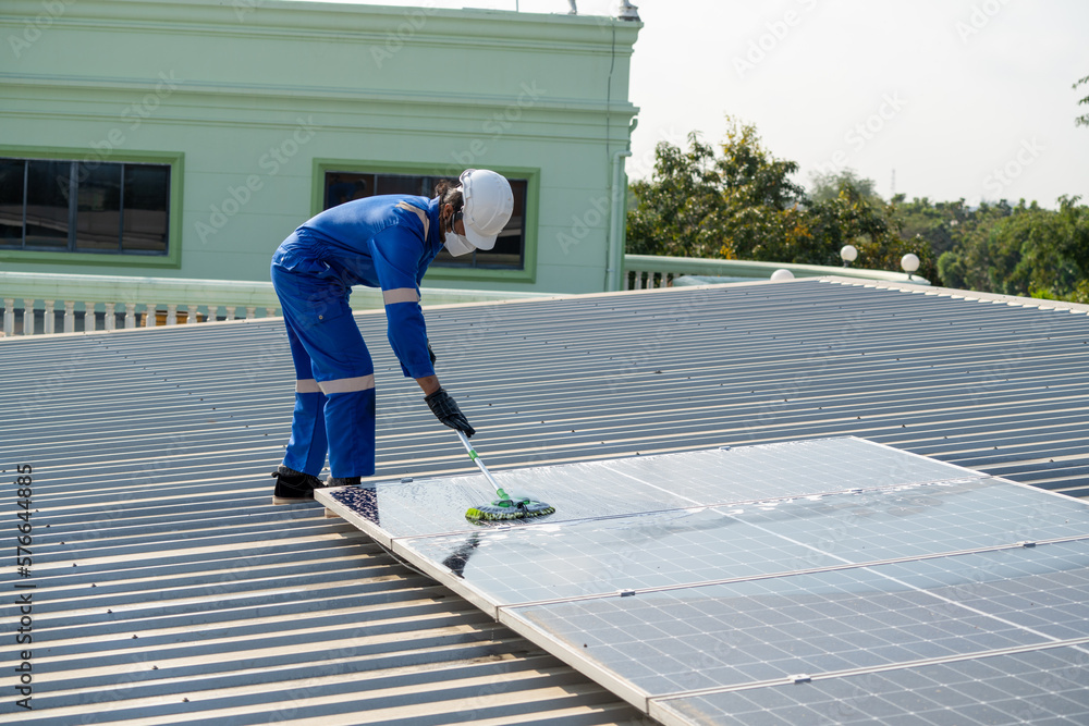 Man using a mop and water to clean the solar panels that are dirty with dust and birds' droppings to improve the efficiency of solar energy storage.