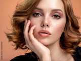 Beautiful young woman with freckles on face. Closeup portrait of an attractive girl with a brown makeup.
