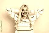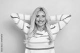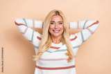 Portrait of good mood nice girl with wavy hairdo wear striped pullover holding arms behind head isolated on pastel color background
