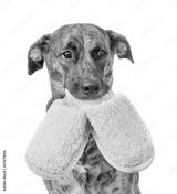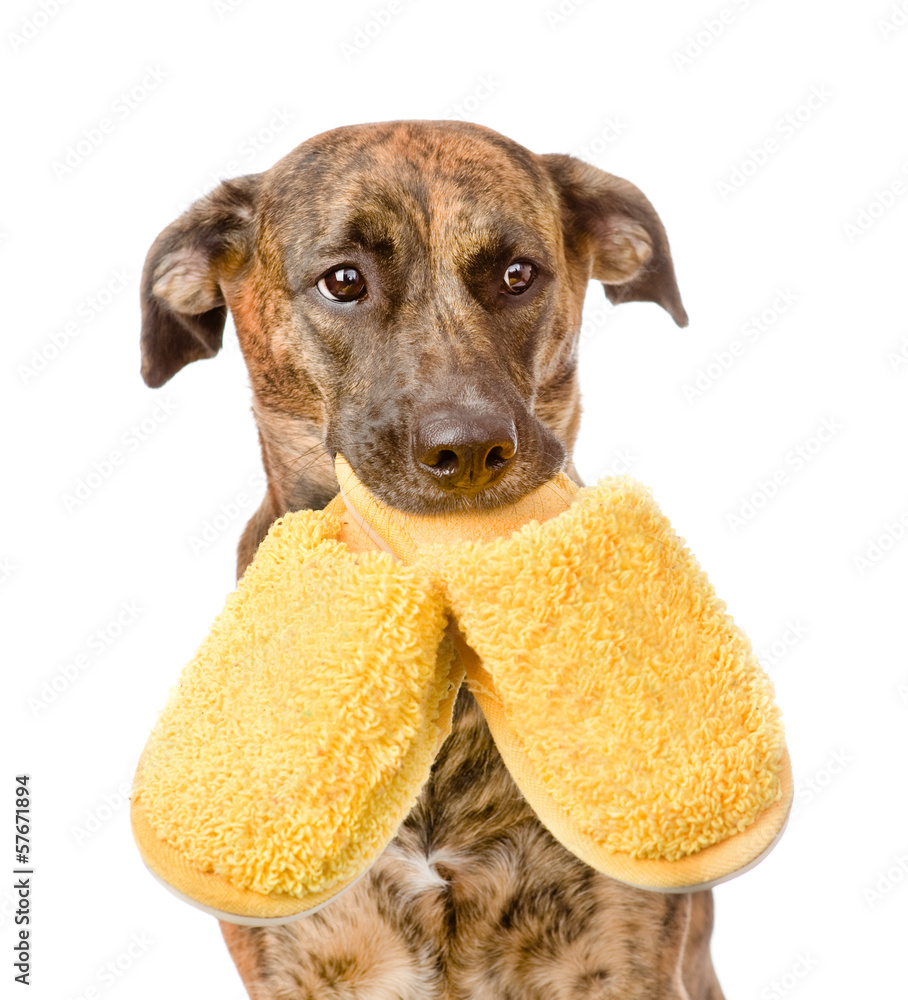 dog holding a slippers in mouth. isolated on white background