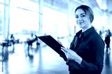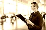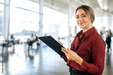 Photo of a confident lovely elegantly dressed caucasian business lady, executive, recruitment, product manager, standing in a business center, holding documents, looking at the camera, smiles friendly