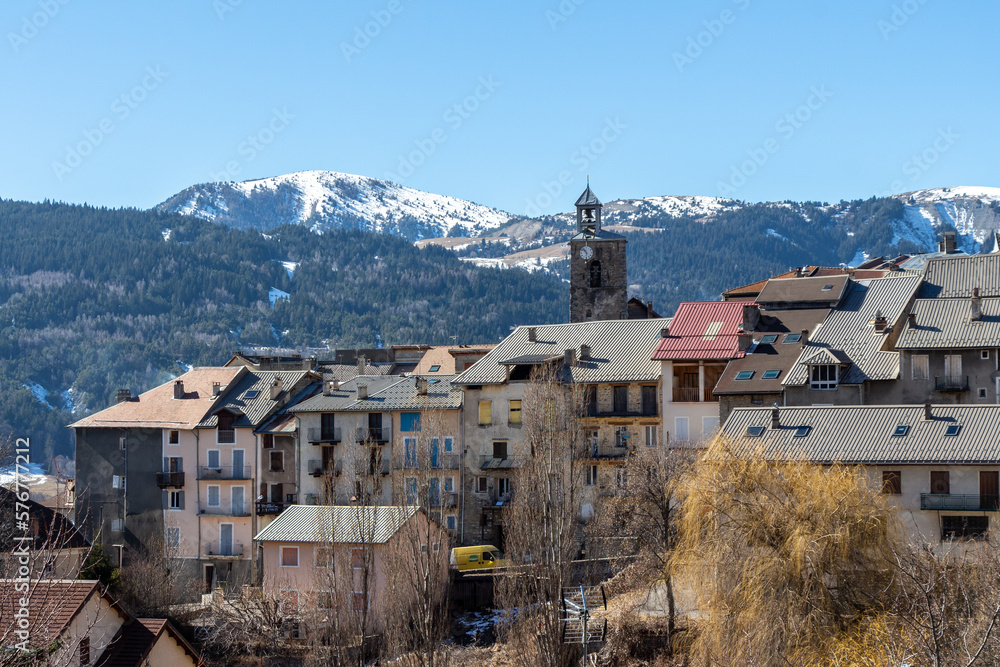 Panoramic view of the city of Seyne (also called Seyne-les Alpes), with the Alps mountains covered with snow in the background.