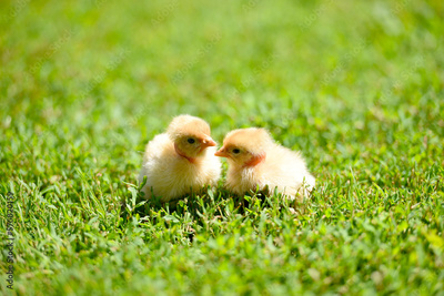 Cute little yellow newborn chicks on fresh and cozy green grass. Selective focus. Two fluffy baby-friends or twins are cuddling on the warm sun, looking curiously at the camera.