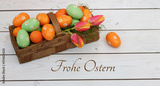 Korb mit grünen und orangefarbenen Ostereiern und dem Text Frohe Ostern.