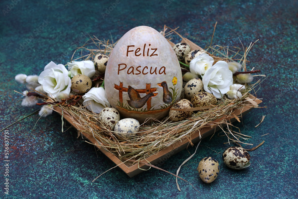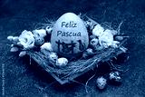 Tarjeta de felicitación Feliz Pascua: Nido de Pascua con huevos de codorniz y un huevo de Pascua con inscripción.