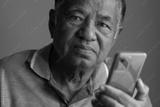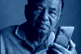 Unhappy elderly man thinking while using smartphone in studio and looking at camera. old man with sad face