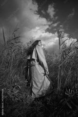 Dreamy gentle woman in a beige raincoat in nature. Romantic young woman in thick tall grass in field. Natural beauty, enjoyment of life