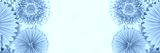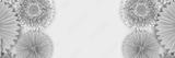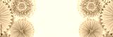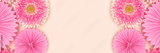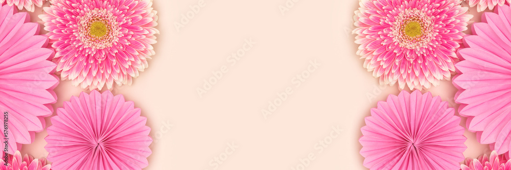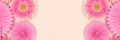 Banner with pink gerbera flowers and tissue paper fans on a beige background. Place for text.