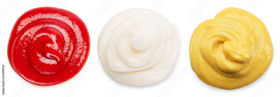 Ketchup, mustard and mayonnaise stains on white background. File contains clipping path.