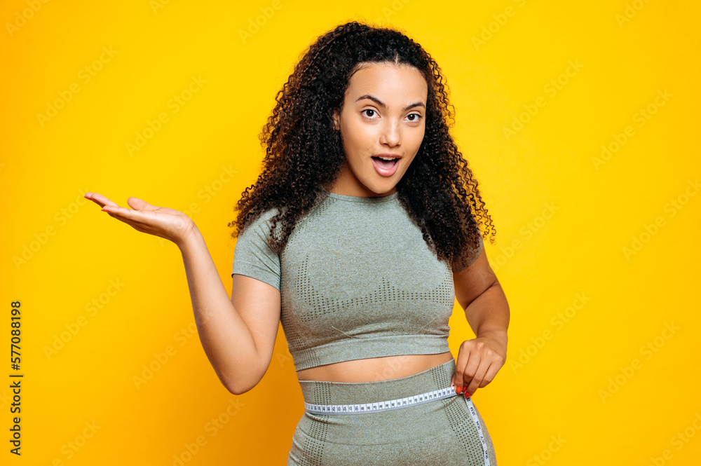 Excited happy fit sporty brazilian or hispanic young woman, in sports wear, stand on isolated orange background, holding centimeter tape and measuring her waist, happy with results. Sport, weight loss