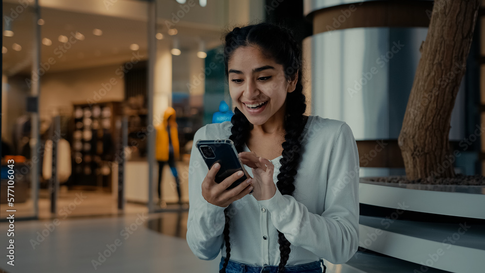 Emotional amazed winner arabian woman shopper use smartphone apps shopping online click on mobile phone screen win internet sales on Black Friday business achievement celebrate auction victory jackpot