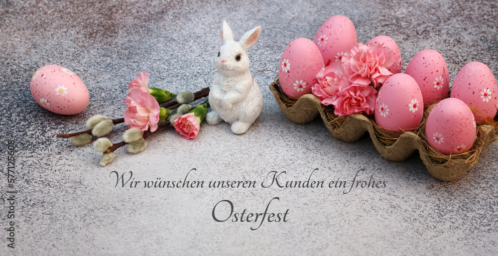 Osterkarte: Osterhase und rosa Ostereier mit dem Text wir wünschen unseren Kunden ein frohes Osterfest.