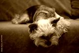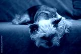 Cute Yorkshire Terrier little dog lies on couch at home. Puppy gift. Canine pet.
