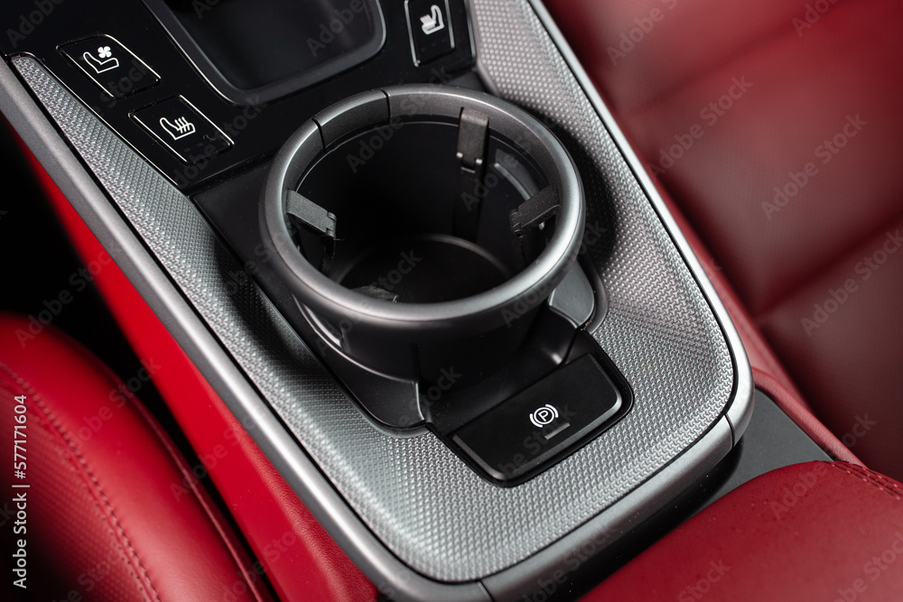 Modern car cup holder close up. Sports car luxury and expensive coupe dashboard panel with mug holder. Luxury interface of new car