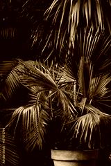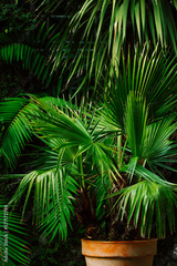 Gorgeous palm trees with fresh green leaves growing in pots.Small palm trees on dark background. Trachycarpus fortunei, Chinese windmill palm, Chusan palm - hardy evergreen tree in Arecaceae family.