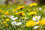 Spring flowers on a green lawn glade among the grass, yellow dandelions and white daisies. Floral bright natural background. Good arm sunny weather in daytime. Springtime season nature plants in bloom