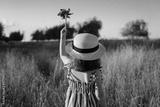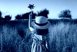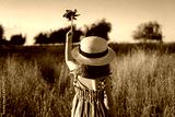Little girl holding up a pinwheel toy against clear sky in the meadow