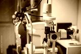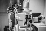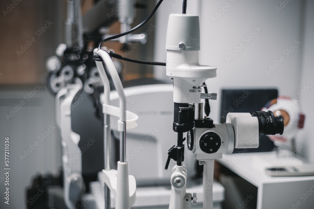 A doctor's ophthalmology office, with a white photo-coagulation laser machine in focus and surroundings, creates a sterile, clinical environment in the foreground