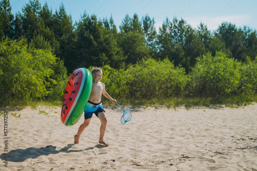 cute caucasian boy carrying rubber ring and butterfly net running into water with laughter. Vacation on sea side. Happy childhood. Image with selective focus.