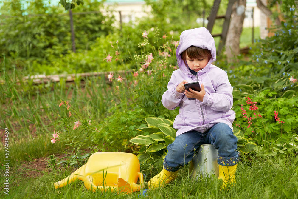 A little girl with a smartphone in her hand in the garden near a picturesque flower bed with hostas and blooming aquilegia. She is sitting on a bucket, with a watering can next to her.
