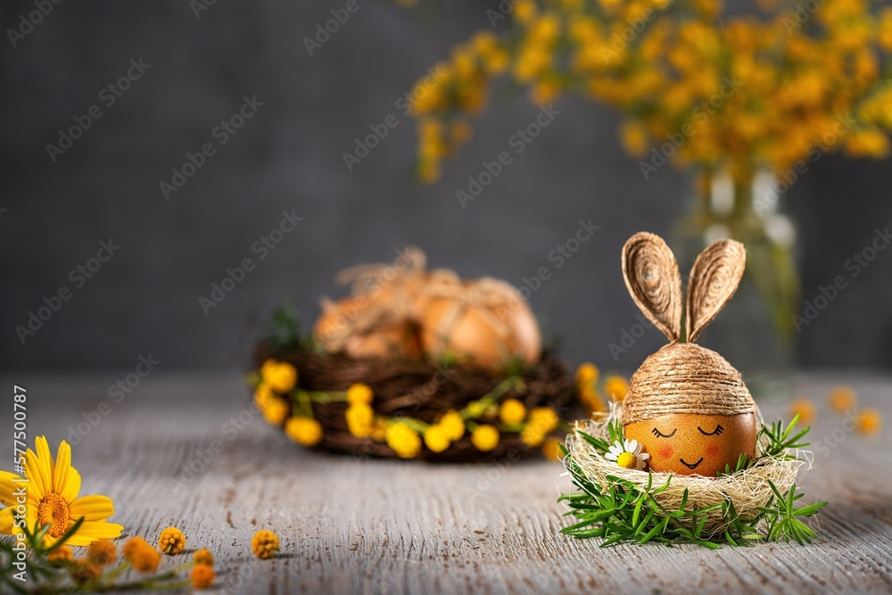 Easter bunny egg. Egg decorated with twine like a cute rabbit. Handmade toy.