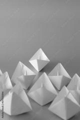 Leadership, teamwork and courage concept. White paper boats on blue background.