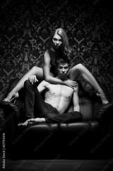 A young and beautiful couple on a leather sofa