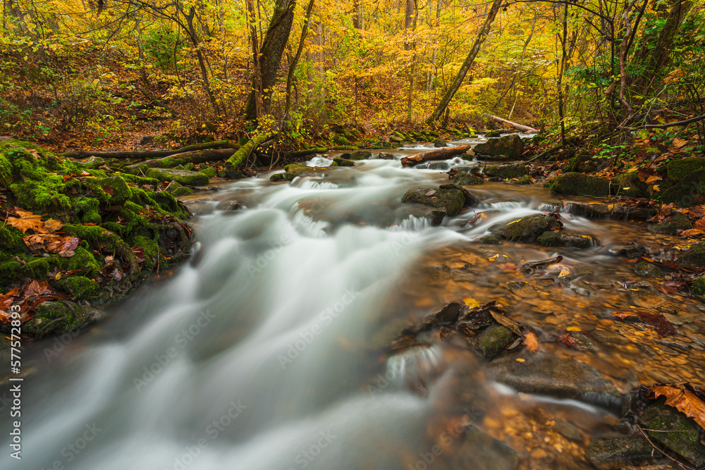 Natural spring water stream flowing through autumn colored forest.