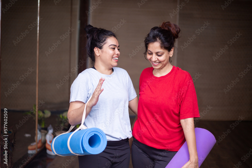 Two Beautiful young happy indian woman holding yoga mat laughing and talking after class or fitness lesson.