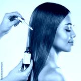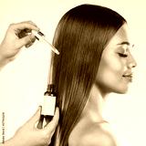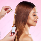 Woman, studio profile and hair care oil for shine, health and treatment for beauty, strong and wellness of scalp. Happy gen z model, serum and liquid formula for cosmetics, healthy locks and smile