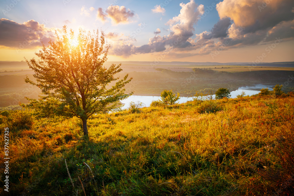A fabulous view of a meadow with a tree and the sun shining through the branches.