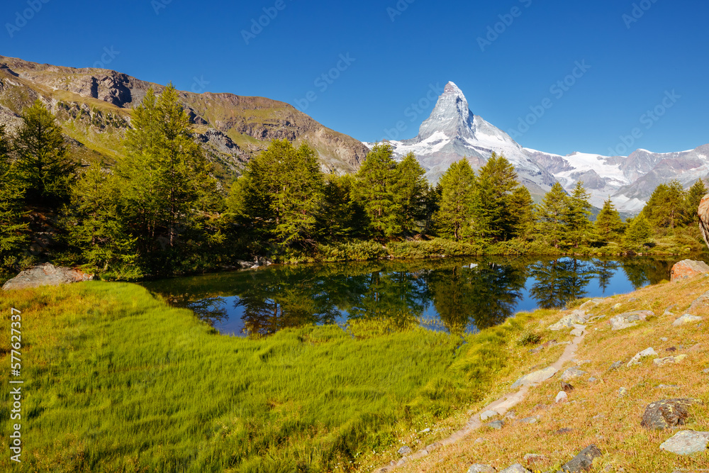 Great view of Grindjisee lake with famous Matterhorn spire. Swiss alp, Europe.