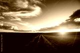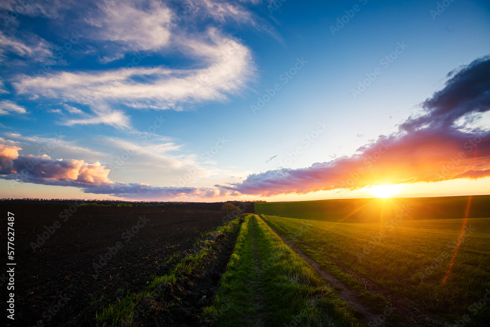 Majestic sunset with cloudy sky in rural area and agricultural land.