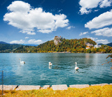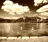 White swans floating on the lake Bled, in the background the castle Blejski grad on a high cliff. Slovenia.
