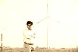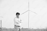 Confident India man wearing shirt standing cross arm at windmill farm or wind turbine farm, Clean and green energy. operation to generate electricity,