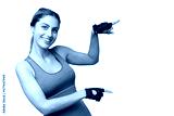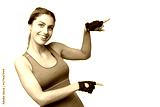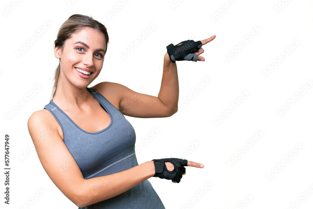 pretty Sport Uruguayan woman over isolated background pointing finger to the side and presenting a product