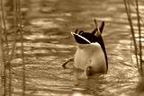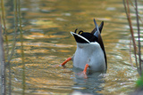 Mallard duck male diving in water in a pond searching for food with their butt raised up in the air.
