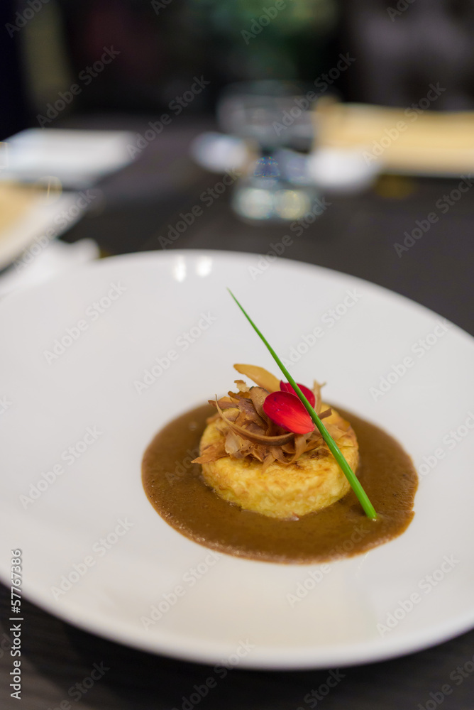 Roasted foie gras with juicy sauce, well cooked duck liver
