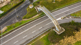 Aerial view of a pedestrian bridge crossing a high-speed road.