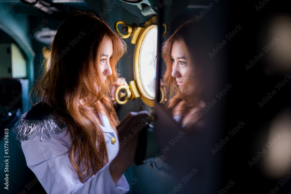 Pretty woman sailor looking through window of battleship