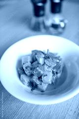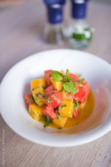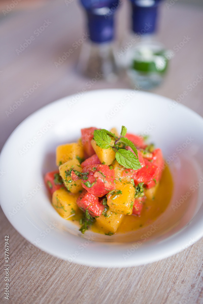 Watermelon salad, fresh ripe fruit dessert serve in white bowl