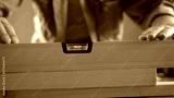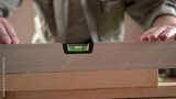 a male craftsman measures the plane with the building level of his working project. close-up.