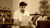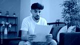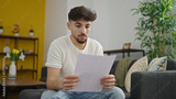 Young arab man reading paper sitting on sofa at home