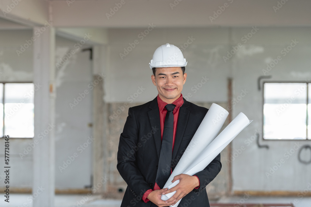 engineer foreman supervisor with helmet standing holding blueprint of project at construction site.