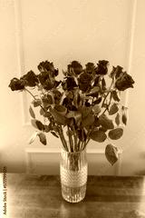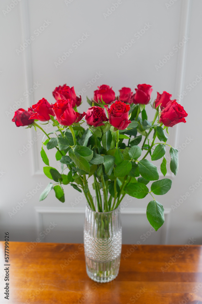 Bright red roses with green leafs on modern minimalistic wall background, vertical shot